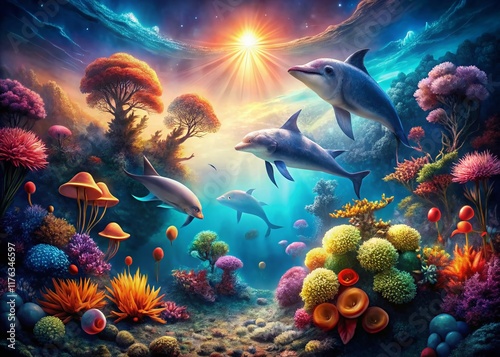 Obraz premium Surreal Underwater Scene: Mystical Sea Creatures in Vibrant Coral Reef