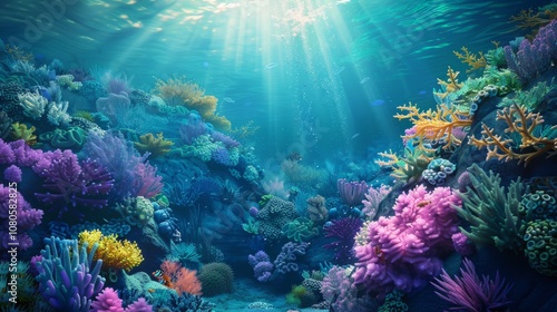 © KerXing, Naklejka premium Surreal underwater texture background showcasing vibrant coral reefs and surreal marine life, transporting viewers to an enchanting underwater world
