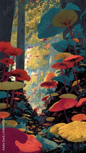 © Justlight, Fototapeta premium Surreal vibrant colorful mushrooms and toadstools are growing along a magical path in an enchanted forest, creating a captivating fantasy scene