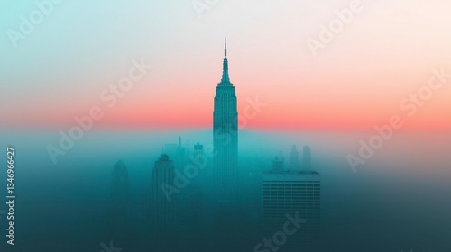 Fototapeta premium Surrealist Manhattan skyline, distorted with abstract strips and set against a pink sky, creating a unique and imaginative version of the iconic city , Minimalism Clean and clear background color,