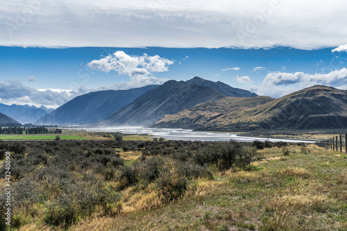 © Stewart, Fototapeta premium Surrounded by mountain ranges the extreme arid dry farming fields in the Rangitata Valley in Canterbury NZ