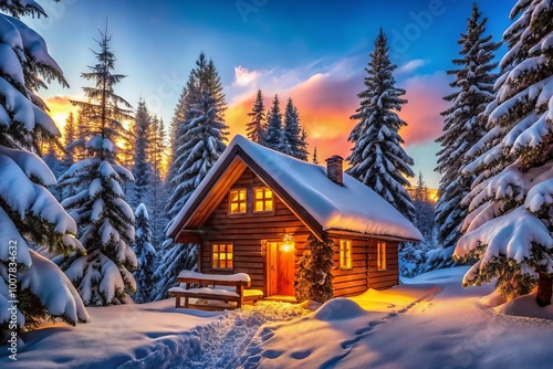 Fototapeta premium Surrounded by snow-covered pine trees, a charming cabin radiates warm light...