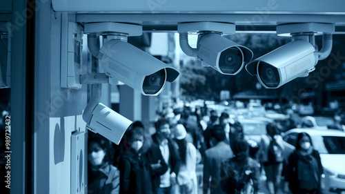 © ontsunan, Naklejka premium Surveillance cameras outside a building, monitoring a busy city street full of pedestrians.