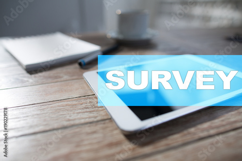 Naklejka premium Survey text on virtual screen. Feedback and customers testimonials. ?Business internet and technology concept.?