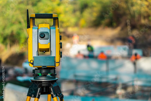 © Freedy, Fototapeta premium Surveyor engineer with equipment (theodolite or total positioning station) on the construction site of the road, building or bridge with construction machinery background