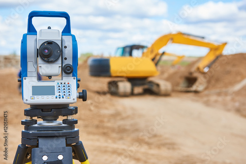 Obraz premium surveyor equipment theodolie at construction site with excavator