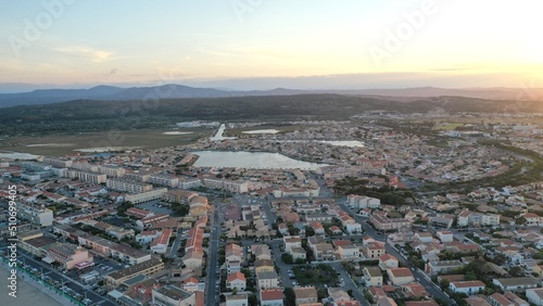 Obraz premium survol de port-la-nouvelle au soleil couchant