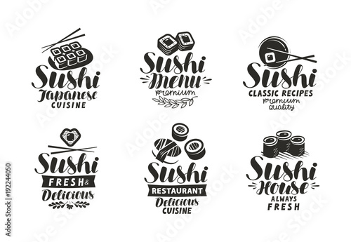 Fototapeta premium Sushi and Rolls logo or label. Japanese food set of symbols. Typographic...