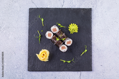 Obraz premium Sushi roll sushi with prawn, avocado, cream cheese, sesame. Sushi menu....