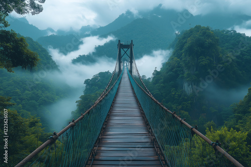 Fototapeta premium Suspended bridge crossing over lush forest with misty mountains in the...