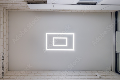 © hiv360, Fototapeta premium suspended ceiling with halogen spots lamps in form of squares and rectangles and drywall construction in empty room in apartment or house. Stretch ceiling white and complex shape.