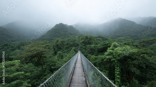 Obraz premium Suspended mist over lush rainforest canopy bridge evokes mystery, perfect for...