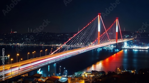 © Umianifaturosidah, Naklejka premium Suspension Bridge at Night with Light Trails Over Water