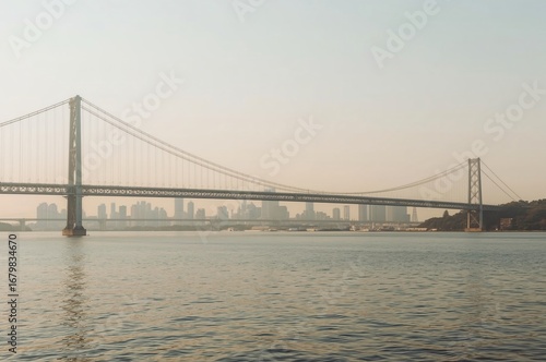 Naklejka premium Suspension bridge, city skyline, hazy sunrise, calm water, travel brochure