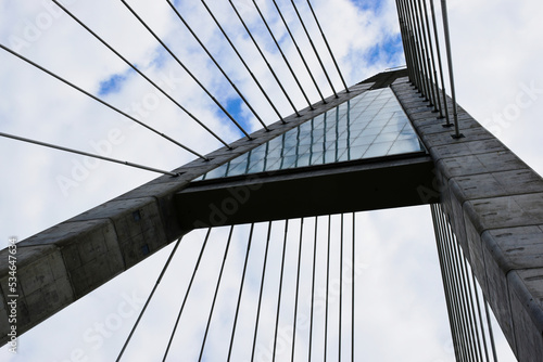 © Istvan, Fototapeta premium Suspension bridge concrete tower frame detail with heavy white steel tube cables. perspective view. blue summer sky beyond. construction and architecture concept. spiral welded steel pipe structure