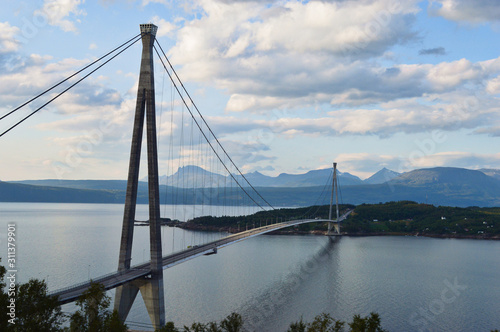 © Jakub, Obraz premium Suspension bridge connecting Islands with mountains in background in narvik, Norway