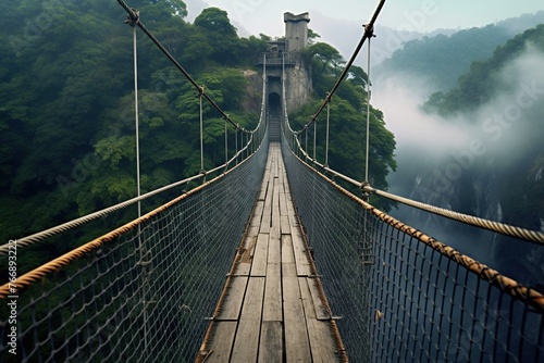 © Mariana, Obraz premium Suspension bridge enveloped in mist over a forest, Generated AI.