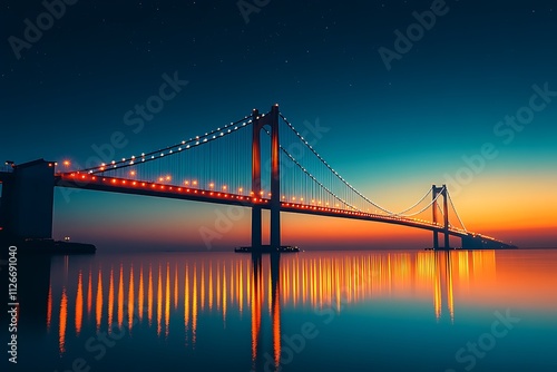 © Liza, Fototapeta premium Suspension bridge illuminated at night reflecting in water at sunset