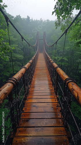 Obraz premium Suspension bridge in the forest, rainy day, green trees, misty rain and foggy...