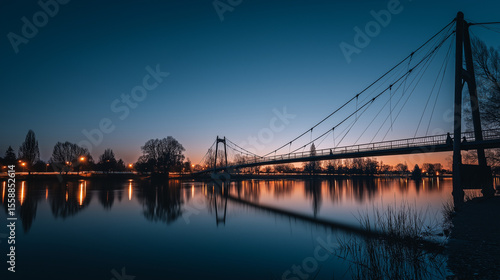 © Niams Haus, Obraz premium Suspension bridge in twilight, reflections on water, long exposure. Urban serenity meets timeless structure.