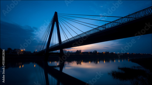 © Niams Haus, Fototapeta premium Suspension bridge in twilight, reflections on water, long exposure. Urban serenity meets timeless structure.