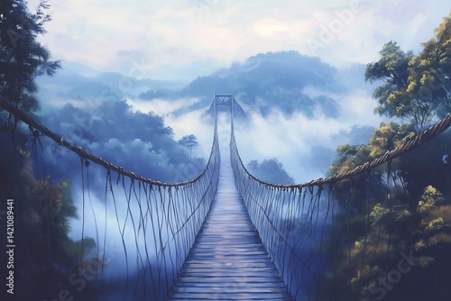 Obraz premium Suspension bridge leading into a misty mountain landscape, shrouded in fog...