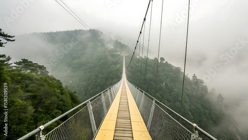 Obraz premium Suspension Bridge Over Green Forest Mountains Disappearing in Fog, Long...
