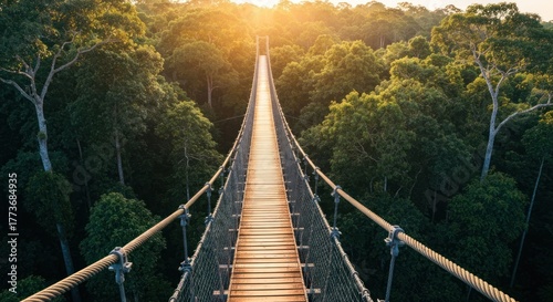 © Lemdah, Fototapeta premium Suspension bridge over lush green forest canopy bathed in golden sunlight