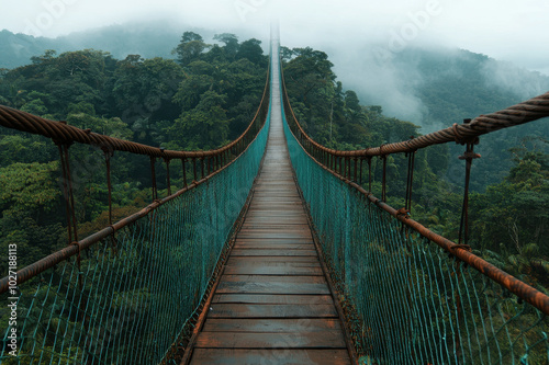 Obraz premium Suspension bridge over lush green forest, misty atmosphere, natural landscape.