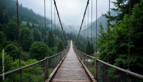 © Elena, Obraz premium Suspension bridge over misty forest valley with rustic wooden planks.