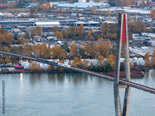 © edb3_16, Naklejka premium Suspension Bridge Over River With Train Crossing Amid Industrial Complex and Autumn Trees