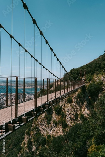 © Udean spinal, Obraz premium Suspension bridge over the river in the mountains with scenic landscape and water view