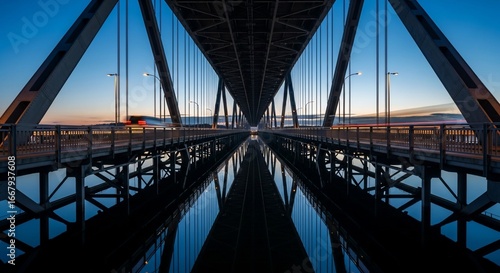 © Ilham, Fototapeta premium Suspension bridge reflection at dusk calm waters symmetrical structure