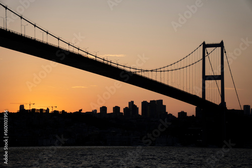 © NS Frames, Obraz premium Suspension bridge silhouette at sunset with city skyline.