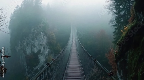 © Tasnim, Obraz premium Suspension bridge surrounded by dense forest in thick fog. Nature landscape photography. Misty atmosphere and adventure concept.