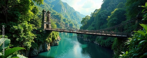 Fototapeta premium Suspension bridge suspended high above river in tropical rainforest, tropical rainforest, aquatic life