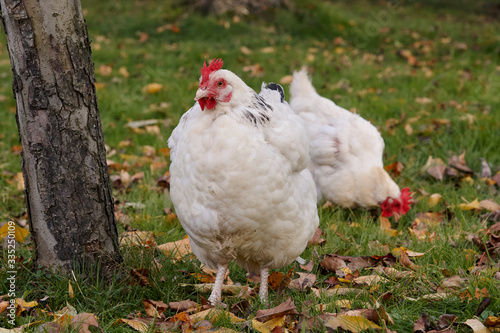 © erwin, Fototapeta premium Sussex chickens pottering under a tree in Autumn