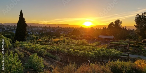 Naklejka premium Sustainable agriculture practices combat climate change for food security in urban gardens at sunset