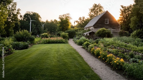 © Sampao, Fototapeta premium Sustainable farm stay with organic vegetable gardens, wind turbines, and a rustic farmhouse.