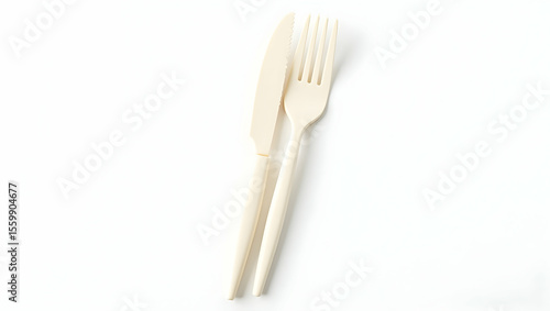 Fototapeta premium Sustainable Food Packaging Compostable knife and fork set made of cornstarch-based material, placed diagonally on white surface