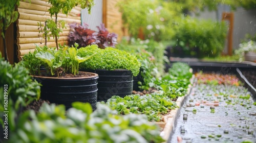 © Zaidi, Obraz premium Sustainable Garden with Rainwater Harvesting System