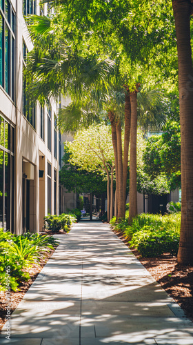 © fadi, Obraz premium Sustainable green building. Eco-friendly building. Sustainable glass office building with tree for reducing carbon dioxide. Office with green environment. Corporate building reduce CO2. Safety glass.