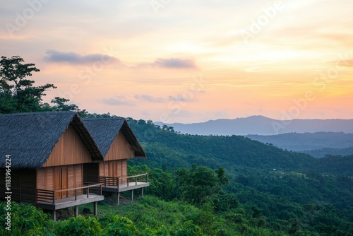 © AucArtStudio, Fototapeta premium Sustainable living tips concept. Scenic wooden cabins nestled in lush green hills at sunset.