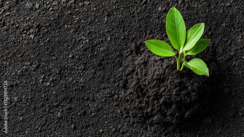 Naklejka premium Sustainable Organic Food for an Eco-Friendly Lifestyle, A small green plant sprouts from dark soil, symbolizing growth and renewal.