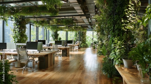 Fototapeta premium Sustainable Workspaces. Eco-friendly offices, leafy plants, natural materials.