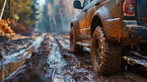 Fototapeta premium Suv caked in mud boasts an extreme journey through natural trails