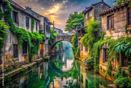 Fototapeta premium Suzhou Canal Exploration: Urban Decay, Chinese Waterways, Ancient Bridges,...