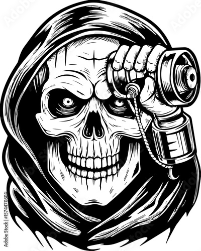© Jessada, Fototapeta premium SVG of a graffiti-style skull head with bold urban flair. Grim Reaper Holding Vintage Telephone in Dark Illustration