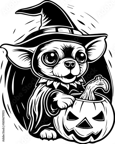 Fototapeta premium SVG of a Halloween dog wearing a witch hat with a pumpkin in a cute festive style. Cute Witch Dog with Pumpkin for Halloween Celebration Decor