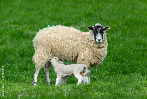 Naklejka premium Swaledale Mule ewe, a female sheep, with two newborn lambs suckling milk, in lush green pastureland. Concept: A Proud mum. Facing forward. Horizontal. Space for copy.